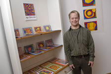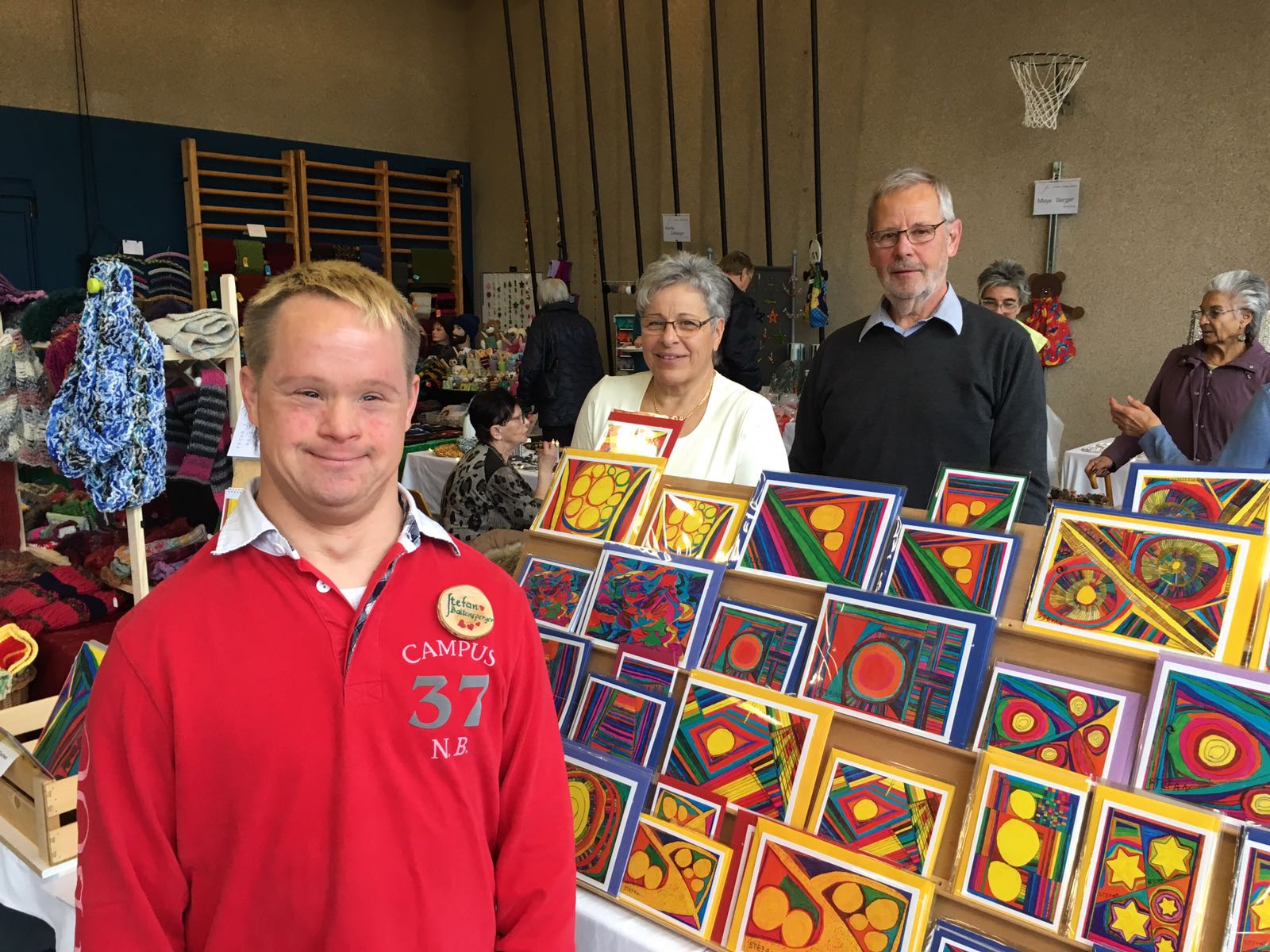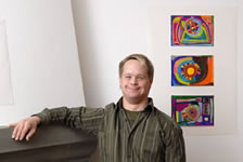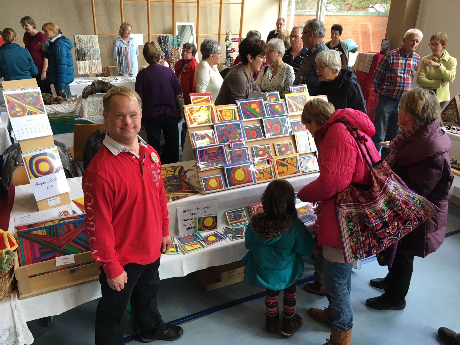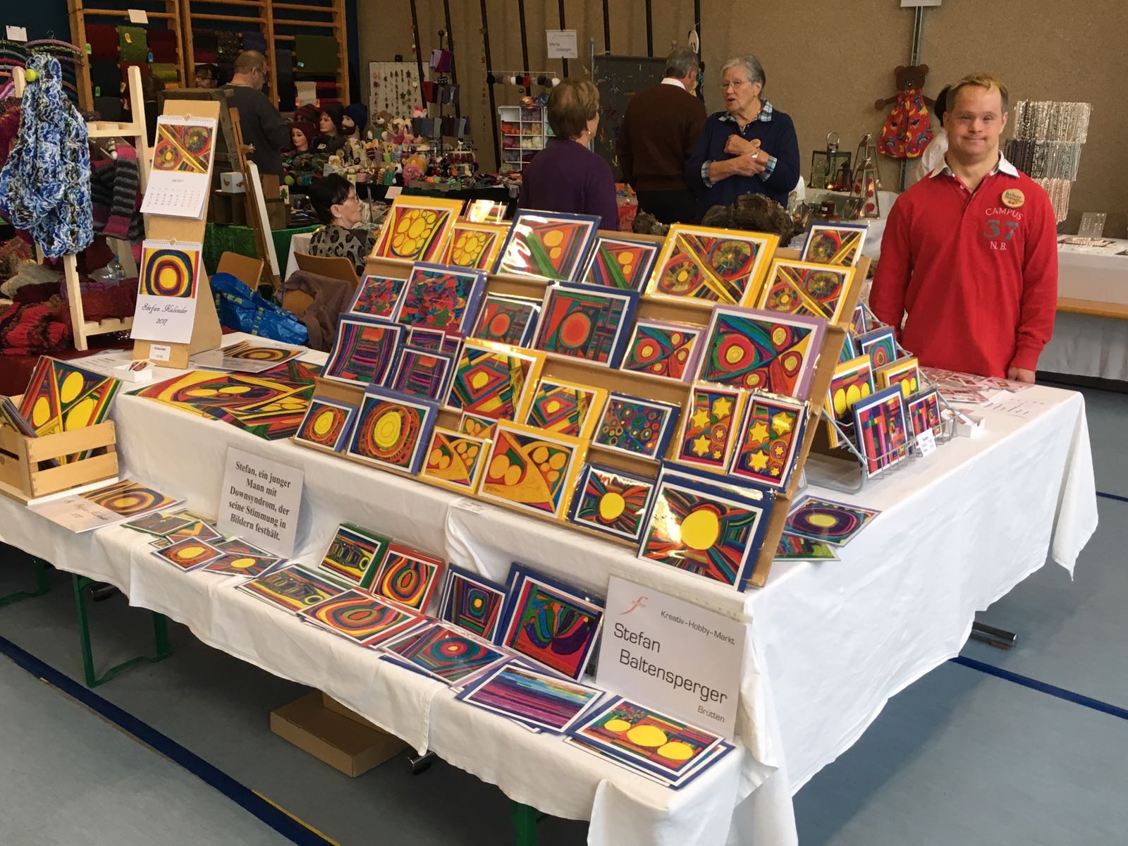 Impressionen Stefan bei seiner künstlerischen Arbeit Ein auf der Staffelei aufgespannter Papierbogen zeichnet Stefan mit Linien vor, und malt sie anschliessend aus. Stefan malt mit hochwertigen Filzstiften und hört dazu Schlager der Volksmusik.